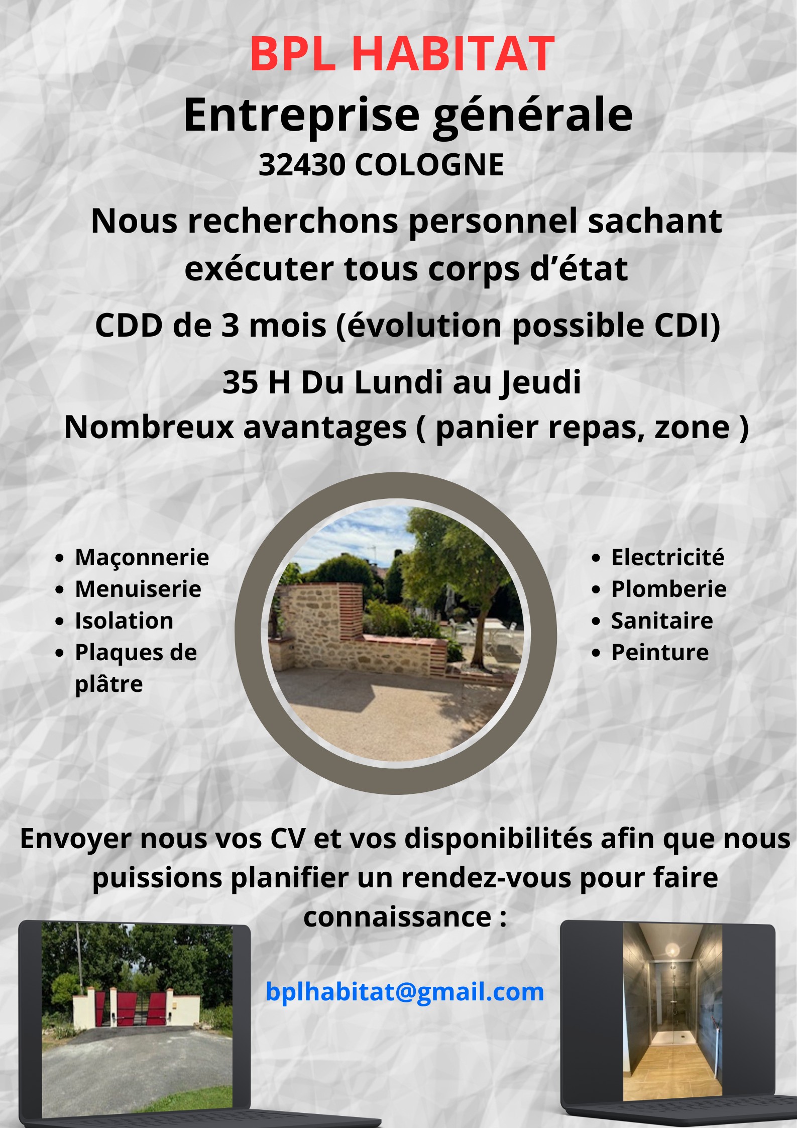 BPL HABITAT est fondée par Bruno PELLUCHI en 2016 dans le Gers. Nous intervenons dans un rayon de 50 kms autour de Cologne, couvrant des zones comme Toulouse, Auch, Gimont et L’Isle Jourdain.